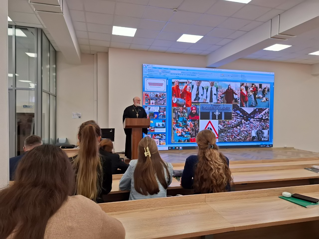 Слушателями обзорной лекции по сектантству стали учащиеся на специальностях Правовое обеспечение национальной безопасности и Судебная и прокурорская деятельность. Отец Александр говорил об экстремистской и террористической идеологии, присутствующей в ряде сект. Поделился своим опытом общения с сектантами, опытом сотрудничества с Министерством внутренних дел по расследованию особо тяжких преступлений, совершённых псевдорелигиозными организациями. Лекция переросла в живой диалог - студенты живо интересовались неоязычестве и различными прикрытиями, которыми пользуются различные секты - псевдообразовательные, песедооздоровительные, политические, псевдоспортивные и прочие. Много говорили о разрушительной деятельности сект на уровне личности, семьи, общества и государства. Студентов юридического института особенно интересовала именно опасность на государственном уровне, то есть угроза национальной безопасности. Отец Александр в качестве примера привёл ряда сект, которые сотрудничают с западными спецслужбами, а так же указал на принятый в 1998 году Конгрессом США «Акт о международной религиозной свободе», который с тех пор используется и для введения санкций простив неугодных государств, ограничивающих у себя деятельность сект, так и для отстаивания прав экстремистских и террористических групп, если они заявляют о себе как о религиозных.