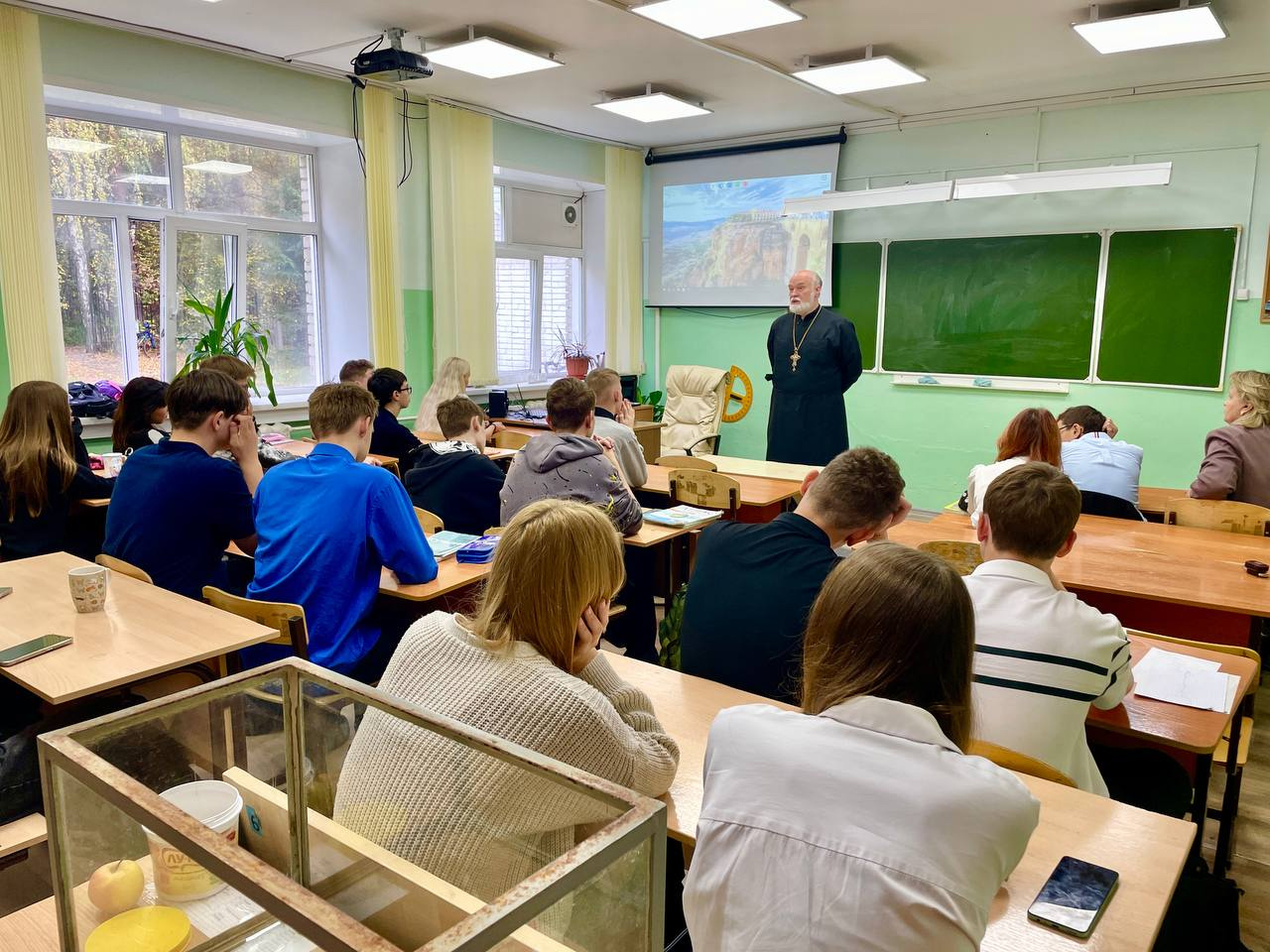 Беседа носила профилактический характер. Отец Александр рассказал старшеклассникам о современных угрозах - об экстремистских и террористических группах, о сектах, о деструктивных движениях и субкультурах, о том, как в них вовлекают, как происходит процесс вербовки, как это распознать и противостоять этому, развивая критическое мышление, о данной Богом каждому личной свободе и о важности выбора правильного пути в своей жизни.