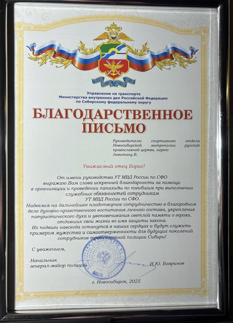 Начальник Управления на транспорте МВД России по СФО Игорь Юрьевич Бояринов наградил клирика Александро-Невского собора иерея Бориса Левитана Благодарственным письмом. Глава транспортной полиции Сибири поблагодарил священника за помощь в благородном деле духовно-нравственного воспитания личного состава и выразил надежду на дальнейшее плодотворное сотрудничество.