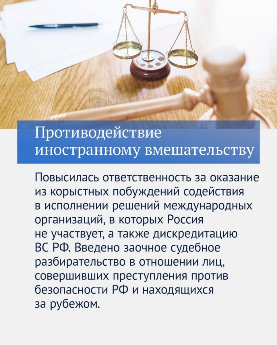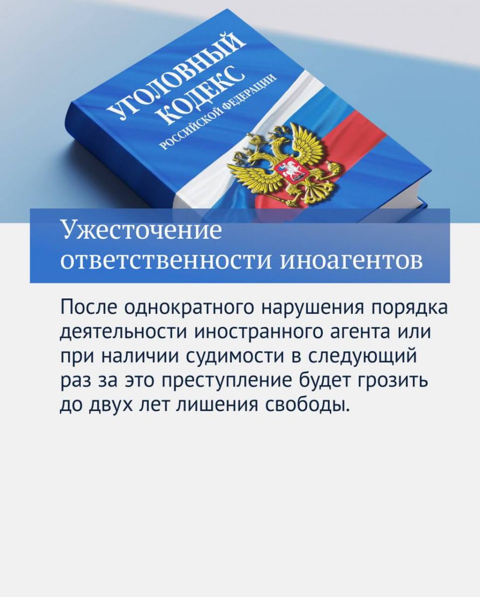 Иноагентам запретили осуществлять просветительскую и образовательную деятельность. Также для них ужесточили наказание. К ответственности будут привлекать и тех, кто нарушил закон, находясь за пределами нашей страны. По словам Председателя ГД Вячеслава Володина, «принятые решения предусматривают меры, направленные на противодействие иностранному вмешательству во внутренние дела России, а также пресечение преступлений против ее суверенитета». «Те, кто предал нашу страну, не должны иметь возможность уйти от правосудия и ответственности», — говорил он.