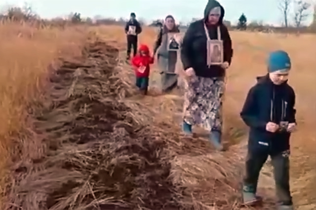 «А вот это скрин с видео из той организации, которое мы увидели в Сети осенью, — говорит Ирина aif.ru — Ее члены идут по пустоши Крестным ходом, и вот видите, оглянулся мальчик в синей шапочке с привязанной веревкой к шее деревянной иконой? Это Сеня. Словно на нас смотрит и молча кричит о помощи».