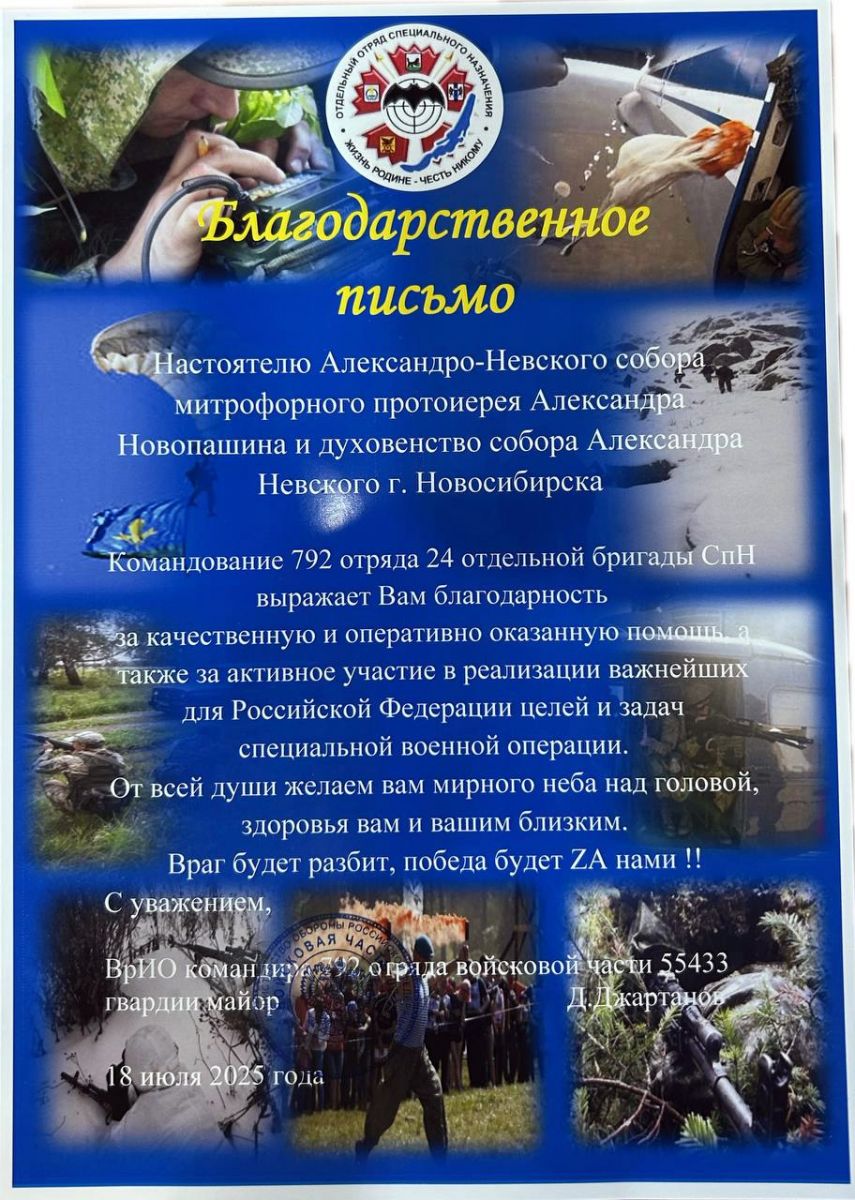 Публикуем Благодарственное письмо настоятелю и духовенству Александро-Невского собора от командования 792 отряда 24 отдельной бригады СпН.