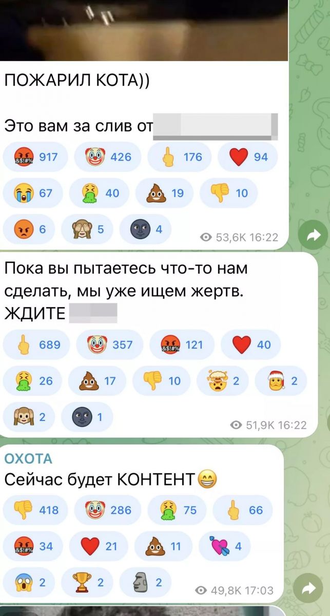 Но то, о чем пишут СМИ, — не фейк. Так, в одном из заблокированных тематических телегам-каналов еще совсем недавно администратор публиковал видео с жестокими расправами над домашними животными, в частности котами. Все это сопровождалось комментариями: «ищу тварь для убийства», «пожарил кота» и прочими в том же духе. Подписчиков — более трех тысяч.