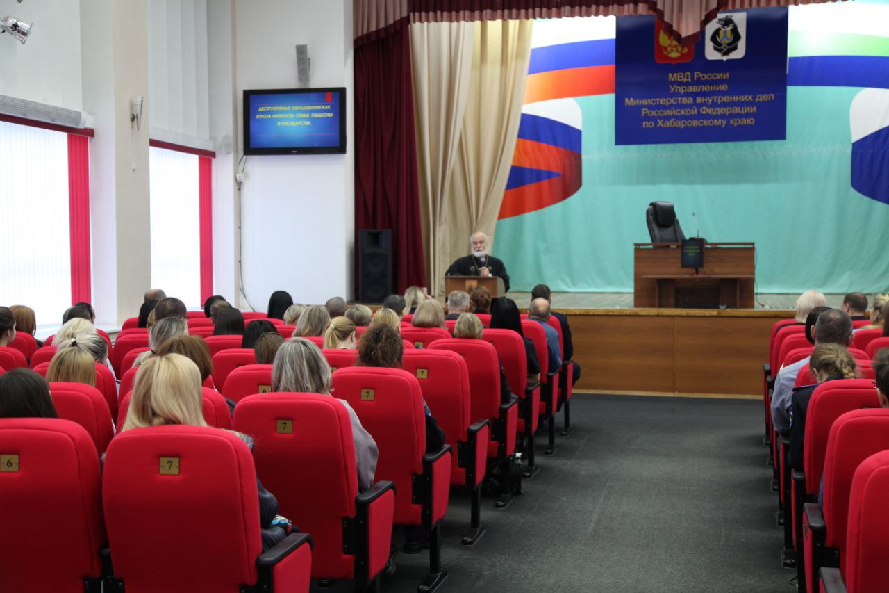 Отец Александр выступил с лекциями перед сотрудниками Управления МВД по Хабаровскому краю, служащими морского отряда Росгвардии и бригады связи. В центре внимания оказались актуальные угрозы, направленные против индивида, семьи, социума и государства, исходящие от различных деструктивных образований, включая секты, террористические и экстремистские группировки, а также деструктивные молодежные субкультуры.