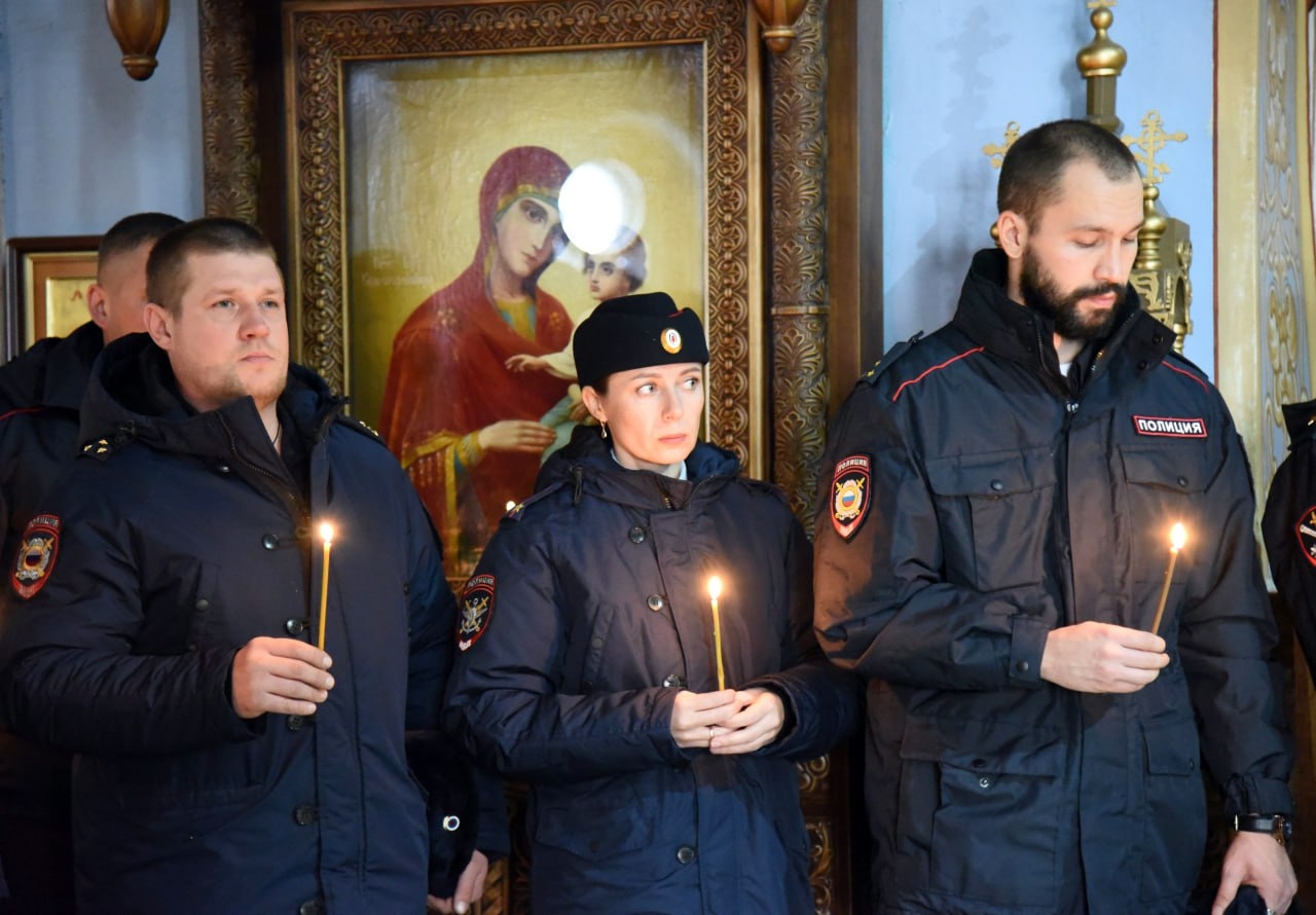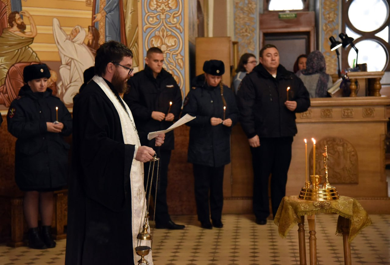 Перед богослужением священник обратился к собравшимся в храме с пастырским словом, в котором сказал, что среди многих христианских заповедей есть основная: нет больше той любви, как если кто положит душу свою за друзей своих. Речь идет о способности человека жертвовать собой ради тех, кого он любит — своих родных, близких, своего народа, Отечества. Сотрудники полиции, погибшие при выполнении служебных обязанностей, не просто исполнили служебный долг, они исполнили заповедь любви, которую дал людям Господь, подчеркнул отец Борис. И пусть, может быть, не все эти люди были глубоко верующими, не все регулярно ходили в храм, но защищая безопасность и благополучие окружающих они, подражая Христу, не пожалели своих жизней. И наш христианский долг усердно молиться о них, прося у Бога о прощении их грехов и дарования им Царства Небесного.
