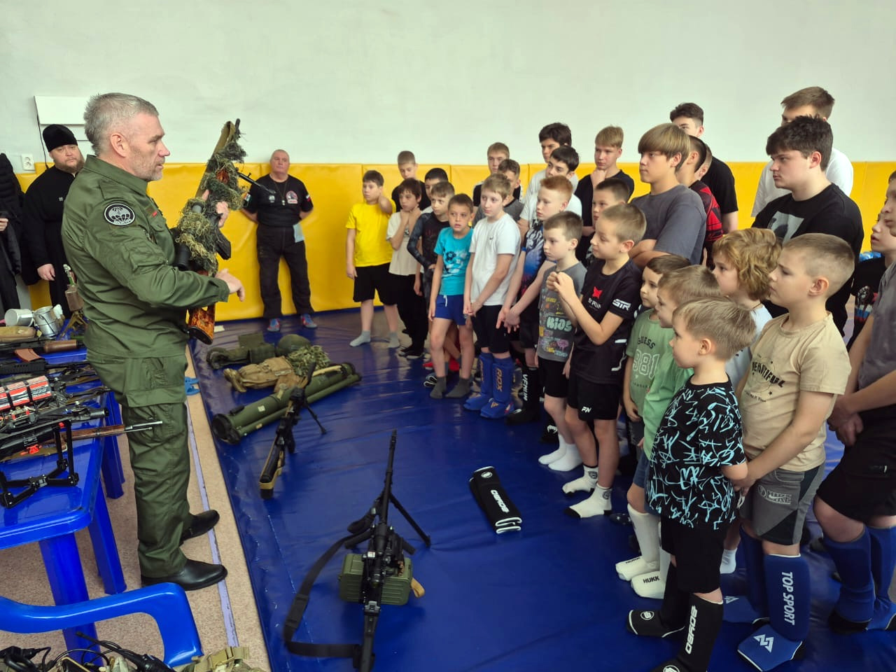 В завершение юных спортсменов познакомили в с различными видами стрелкового вооружения — ознакомительную беседу провели спецназовцы, вернувшиеся с СВО.