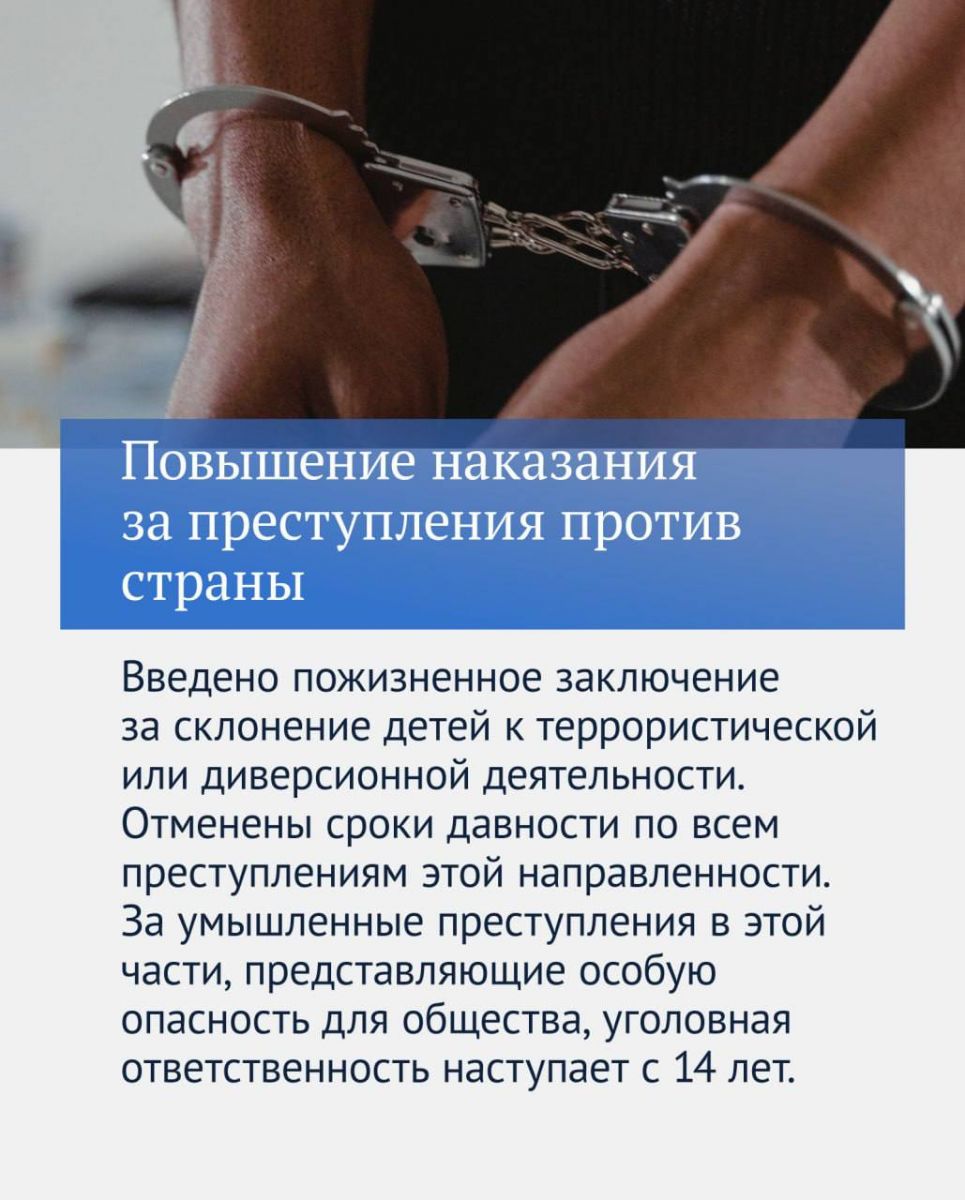 За склонение детей к террористической или диверсионной деятельности введено пожизненное заключение. Отменены сроки давности по всем преступлениям диверсионной направленности. Как отметил Вячеслав Володин, «эти меры направлены на защиту интересов страны, повышение ее безопасности».