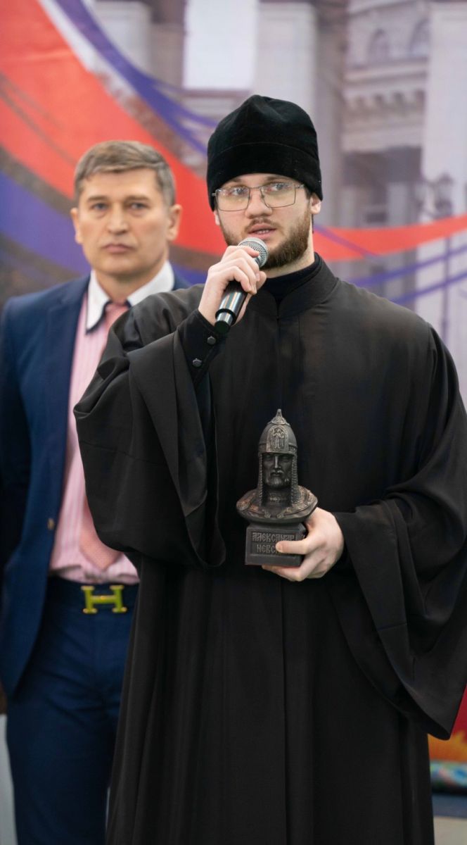 «Занятие спортом есть огромной труд и постоянная работа над собой. Ведь мы становимся лучше только тогда, когда совершенствуемся, когда превозмогаем свои пределы, боремся до последнего. В связи с этим позвольте сегодня от лица Новосибирской епархии представить эту награду — бюст святого благоверного князя Александра Невского «За волю к победе»! Этой награды удостаивается те, кто, ни смотря ни на что, борются до конца, и не обязательно при этом занимают призовые места.