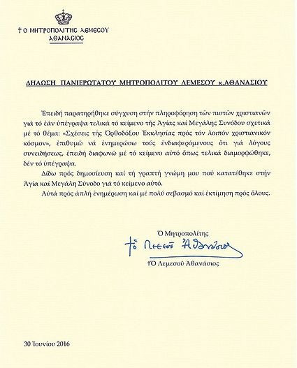 Одновременно с этим митрополит Афанасий придал огласке текст своего обращения по поводу этого документа к «Святому и Великому Собору». Полный текст опубликован на страницах греческого портала «Ромфеа».