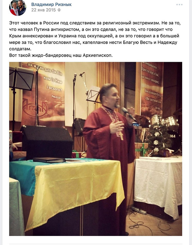 Интересно, что есть и совместные фото Головченко и Ризника (в камуфляжной форме) с Журавлёвым, сделанные где-то на Украине в январе 2015 года. Иначе говоря, и сам поставленный в своё время пастором "Посольства Божьего" Сандеем Аделаджа в архиепископы Киевские и международные Журавлёв не перестаёт опекать страну победившего национализма и Майдана.
